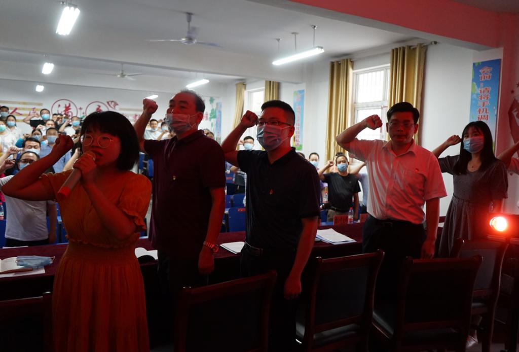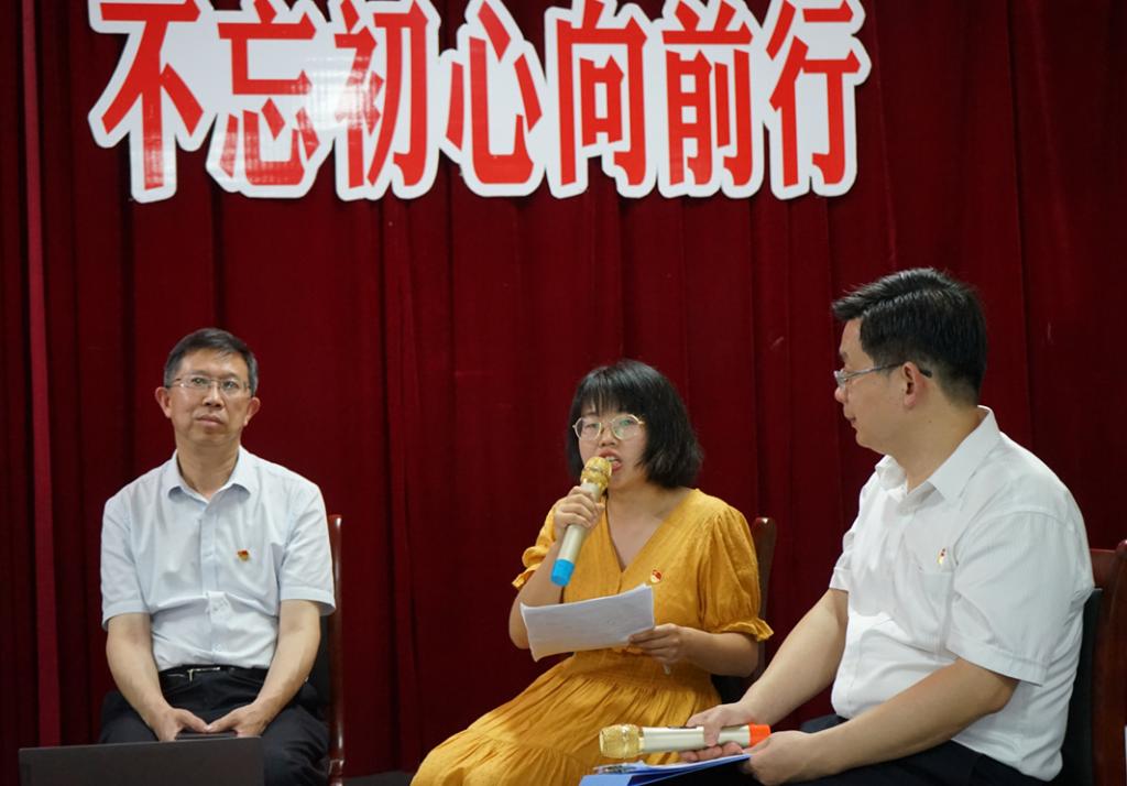 擂鼓镇中心小学青年党员教师代表杨婷婷同志讲述了自己和身边的优秀教师在疫情期间满怀乡村教育热情,关心关爱乡村学龄儿童,深入学困生家庭家访助学,家校合作确保线上教学效果的先进事迹,体现了乡村青年教师的使命和担当。