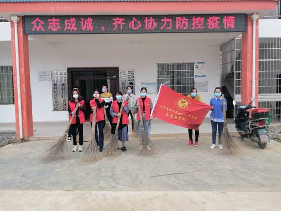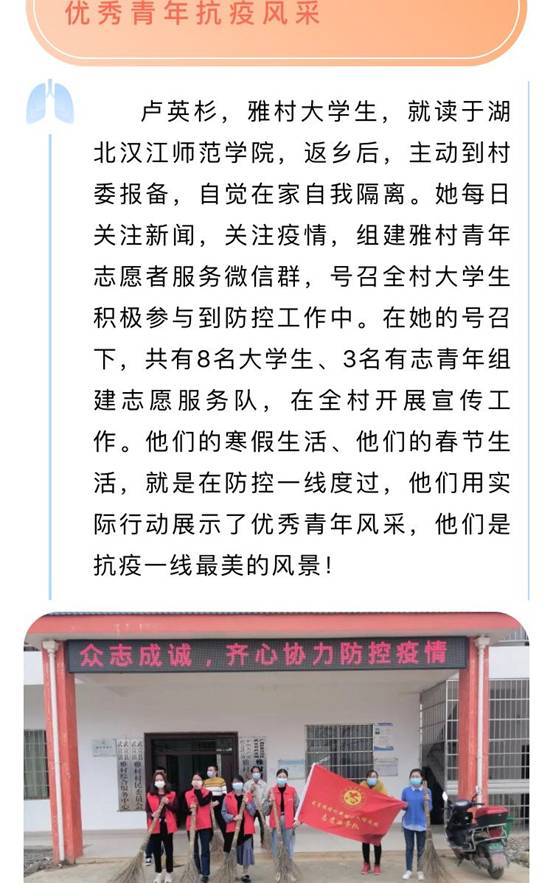小教本科1903班卢英杉,家住广西壮族自治区来宾市武宣县雅村。返乡后,主动到村委报备,自觉在家自我隔离。她每日关注新闻,关注疫情,组建雅村青年志愿者服务微信群,号召全村老员工积极参与到防控工作中。在她的号召下,共有8名老员工、3名有志青年组建志愿服务队,在全村开展宣传工作。他们的寒假生活、他们的春节生活,就是在防控一线度过。