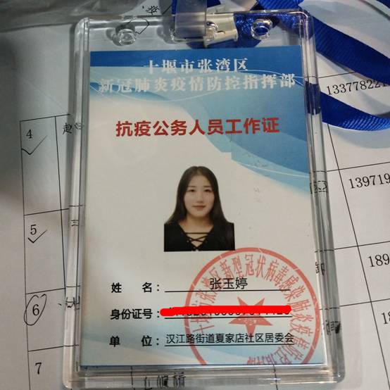 小教1705班张玉婷,十堰市汉江路街道夏家店社区工作人员。疫情发生后她每天都要和社区工作人员一道管控辖区状况。由于辖区内居家人数较多,情况复杂,社区人手不够,张玉婷全力投入到本次战“疫”行动中,每天挨家挨户宣传防控知识、量体温、通知武汉返城人员做好健康登记。日常手头工作在他的安排下有条不紊的进行着,尽自己的最大努力守护着一方水土的平安。