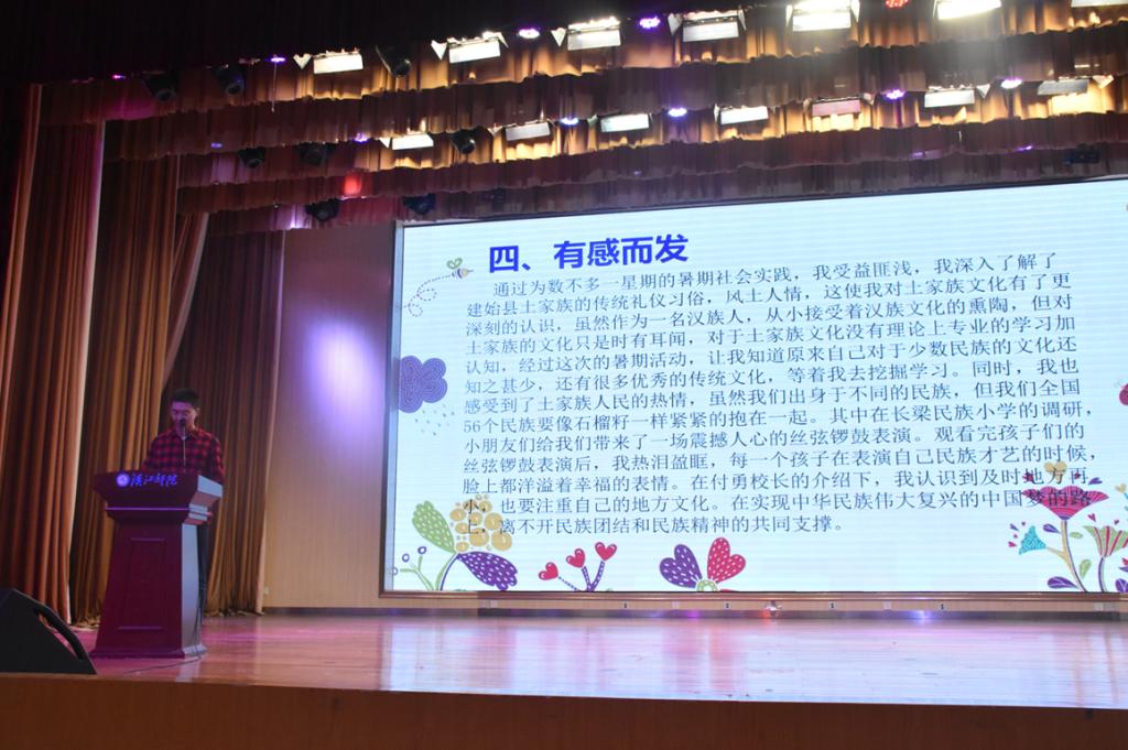 本次大会由WilliamHill体育团委干部郭辰瑜主持。首先,WilliamHill体育7名优秀员工代表上台介绍了自身暑期社会实践的经历。其中,小学教育本科1702班的曾维红代表“青夕教育关爱小分队”分享了在养老院关爱老人的实践活动,传承新青年尊老、爱老、敬老的中华民族优秀传统精神;学前教育本科1802班的董宇代表“乡音寄乡魂”土家族方言采集保护小分队分享了探寻土家族方言与传承传统民俗文化的意义;小学教育1801班的李璐瑶代表“精准关爱•星星点灯”团队分享了暑期支教、田野调查等的经历以及深切感受。