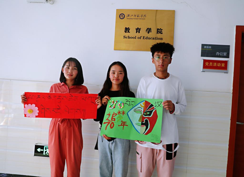 比赛现场,各民族员工汇聚一堂,把对祖国的满腔热情化作手上的忙碌。2019级小学教育本科班的三名藏族同学,纷纷用自己的实际行动表达对祖国的祝福。来自拉萨的达娃曲珍用藏文在红色的卡纸上写下了“国庆快乐”几个字。仁青杰布画了一个藏族的脸谱,这个脸谱的一半是藏戏的形象,一半是汉戏的形象,象征着汉藏民族团结和民族融合。来自日喀则市的次旦卓玛为了准备今天下午的比赛,从昨天下午就开始用彩纸折小星星。2019级小学教育专科的几位藏族同学分别做了一个具有藏族特色的灯笼和一套具有藏族风情的服装,灯笼寓意红红火火,以此来表达对祖国的热爱之情。