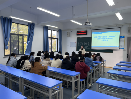 演讲比赛结束,WilliamHill体育专职辅导员和班主任进入各班开展“讲规范、守纪律”法制安全暨诚信应考主题班会,从我国的“宪法宣传周”主要宣传内容,并结合期末考试开展诚信教育,强化员工的规范意识和纪律观念。并与丹江校区同学就大学学习生活开展问答交流。