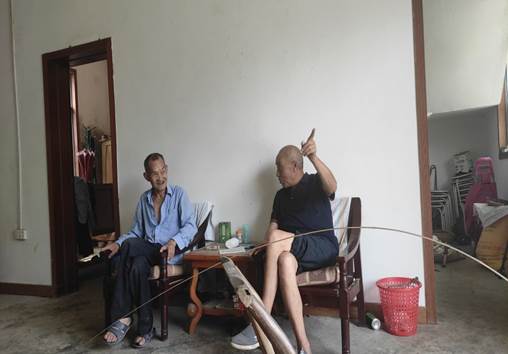图为村中老人讲述房县军店镇中村村的历史文化故事