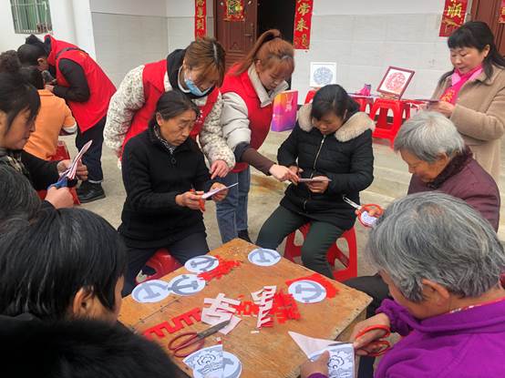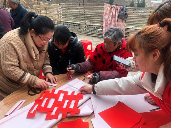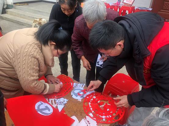 在村干部的带领下,支部党员老师和员工志愿者分为两组——手工组和后勤组——兵分两路行动起来。手工组由老师带领员工,以及当地的村民进行剪纸活动,教村民们制作设计有党徽标志的手工剪纸。庭院里,圆桌前,一群年逾半百的老人认真专注于手中方寸之纸,员工志愿者们开心愉悦地帮助裁剪,温暖的画面让寒风也带上了暖意。