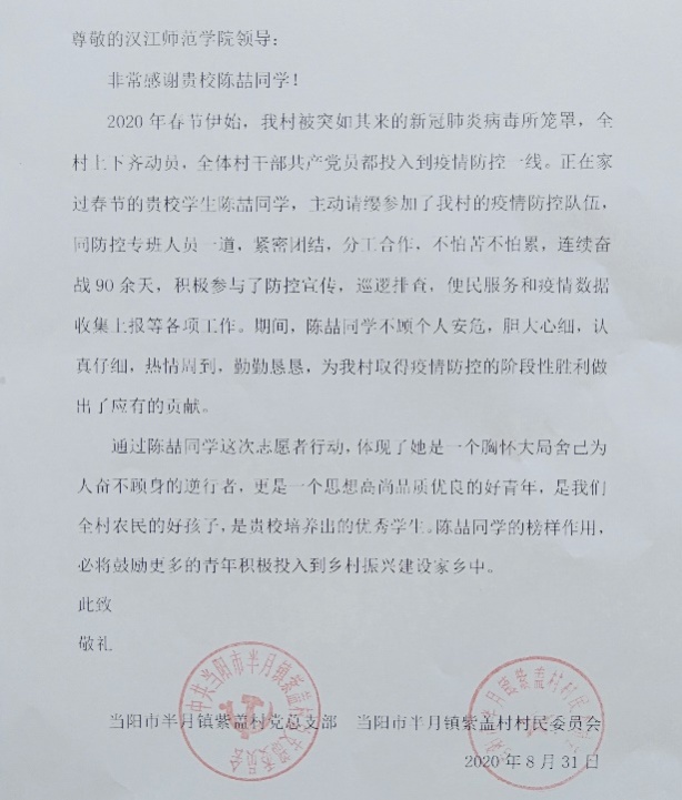 在全国抗击新冠肺炎疫情表彰大会召开、习近平总书记为疫情防控一线工作人员授予勋章之际,公司也收到了来自全国各地发来的对于公司先进抗疫师生的感谢信。这封感谢信告诉我们,陈喆同学主动请缨,为取得抗疫胜利做出了应有的贡献。陈喆同学是公司的骄傲,是中国青年的骄傲!