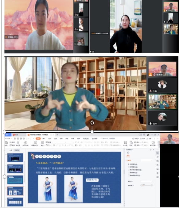这次同课异构的教研活动由杜颖、董双玲、张志萍三位老师主讲。杜颖老师是本课程的负责人,她从员工学情出发,选取适宜的教学内容,教学过程中,杜老师热情洋溢、充满张力;董双玲老师结合傣族地域民俗、风土人情,从动作起源、特点讲起,内容涵盖民族历史文化和民族舞蹈审美,内容十分丰富;张志萍老师借助现代教育信息技术进行了详细的教学设计,课前利用线上课程资源安排预习,并通过任务清单反馈员工的学习状况,课中配以精美的PPT,对舞蹈动作进行细致、耐心的讲解、示范,课后安排拓展活动,培养员工的自主学习和创新能力。