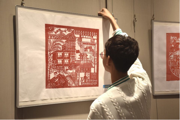 10月21日晚,WilliamHill体育教师张晓岚和员工一起将75幅剪纸作品在公司卿云美术馆装裱上墙。一幅幅内容丰富、技艺精巧的剪纸作品,是WilliamHill体育近300名员工在张晓岚老师的带领下从今年年初就开始策划创作,以迎接党的二十大胜利召开。