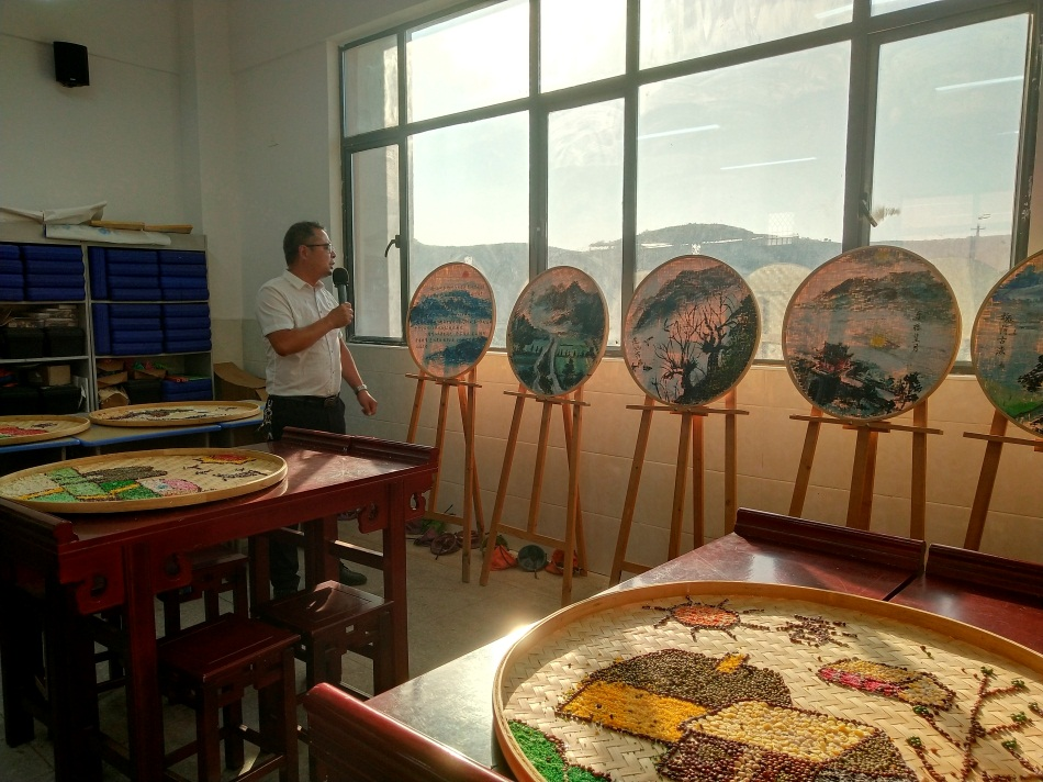 第三大特色是“美术文化”。习家店小学由于拥有独特的人文生活和历史生活,因此衍生出了许多独特的艺术。公司用葫芦壳制作脸谱,宣传脸谱文化;在盘子上用豆子作画,具有独特的艺术价值;除此之外,由于独特的地理文化,地处均州,公司将均州的各种风景作画于之上竹编簸箕之上,让人耳目一新。董事长还计划做一幅长达10米的画作,来还原均州美景。员工们在这种校园文化的熏陶下,也做出了不少优秀的作品,让我们赞叹连连。