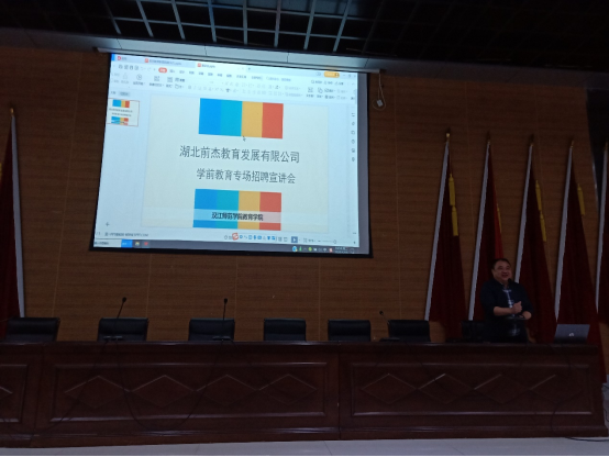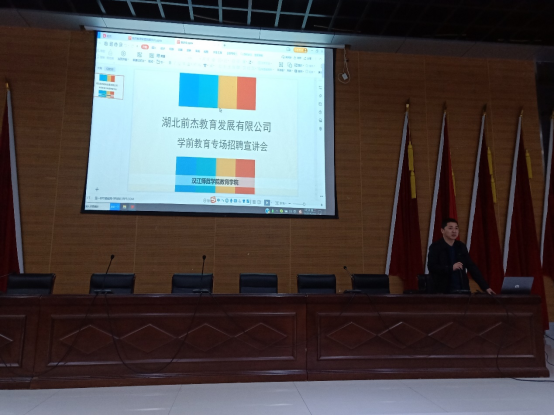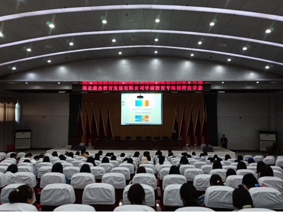 5月10日晚七点,湖北前杰教育发展有限公司在主校区学术报告厅为公司学前教育员工开办了专场招聘宣讲会。2022届学前教育专业毕业生参加此次会议。