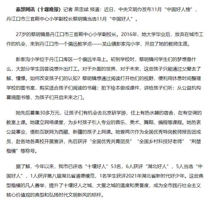 十堰乡村教师蔡明镜入选11月“中国好人”
