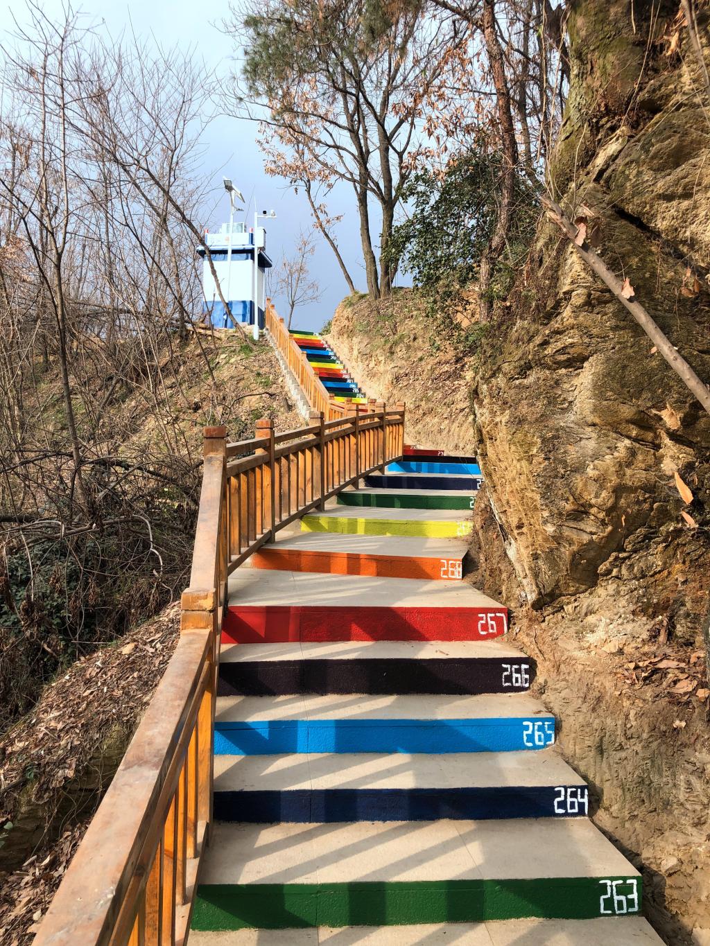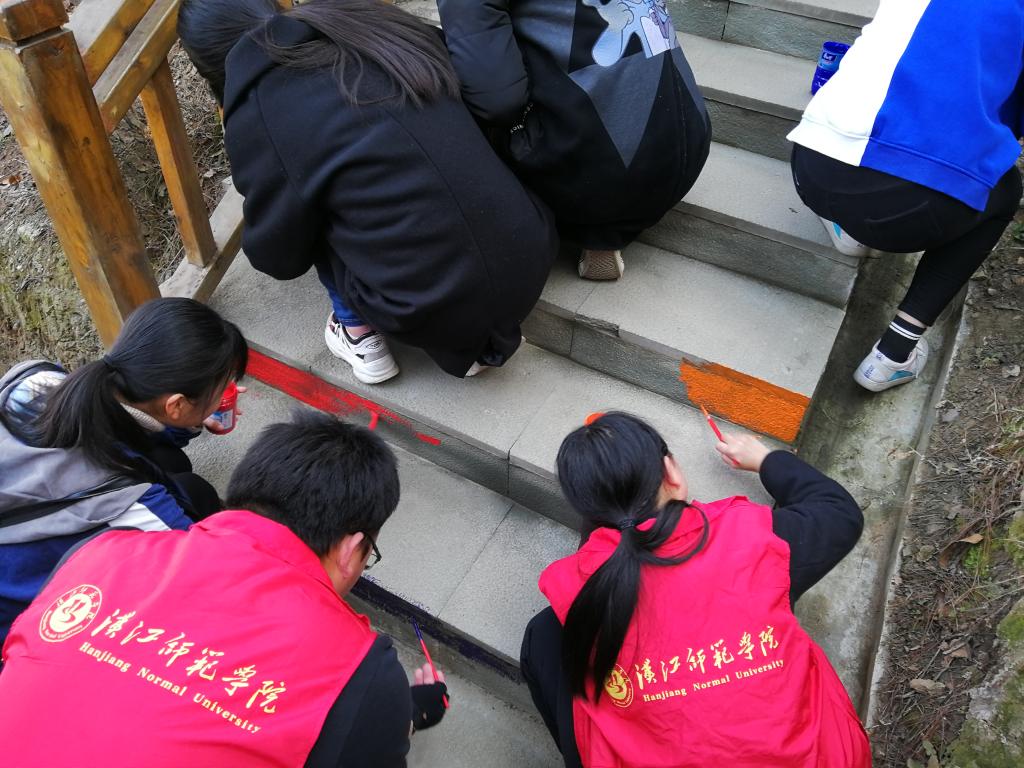 公司党总支副书记郭顺峰介绍,这项创意活动是由该院团委策划、蒲公英志愿服务队组织实施,除了彩绘石阶外,还有提示行人上山下山起到警示安全作用。