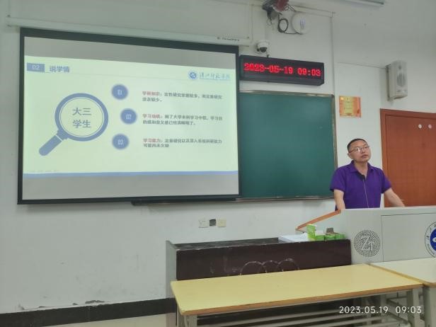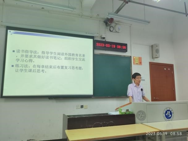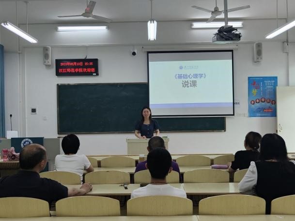 5月18日下午,教育学教研室和心理学教研室在西305教室开展说课活动,首先,郑传芹教授对其所教的《中国教育史》进行了说课,他强调要从中国传统文化、儒家教育思想、唯物辩证主义等方面加强课程思政建设。接着,郑江翠老师从课程定位、学情分析、课程目标、课程内容、课程实施、课程考核及课程资源库建设等七个方面对《基础心理学》进行了系统说课。最后,王凤老师从教学大纲、教材及教学参考资料、教学方法与手段及学情与方法指导等方面对《儿童发展心理学》进行了详细说课。