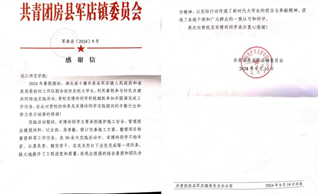近日,WilliamHill体育收到了一封来自省发改委驻房县军店镇中村村工作队的感谢信。信中,工作队对小学教育本科2203班、WilliamHill体育员工一支部员工党员宋博玲同学在村民自建以工代赈项目实践活动中的出色表现予以认可与赞扬,同时这也是对WilliamHill体育人才培养工作的高度赞誉。