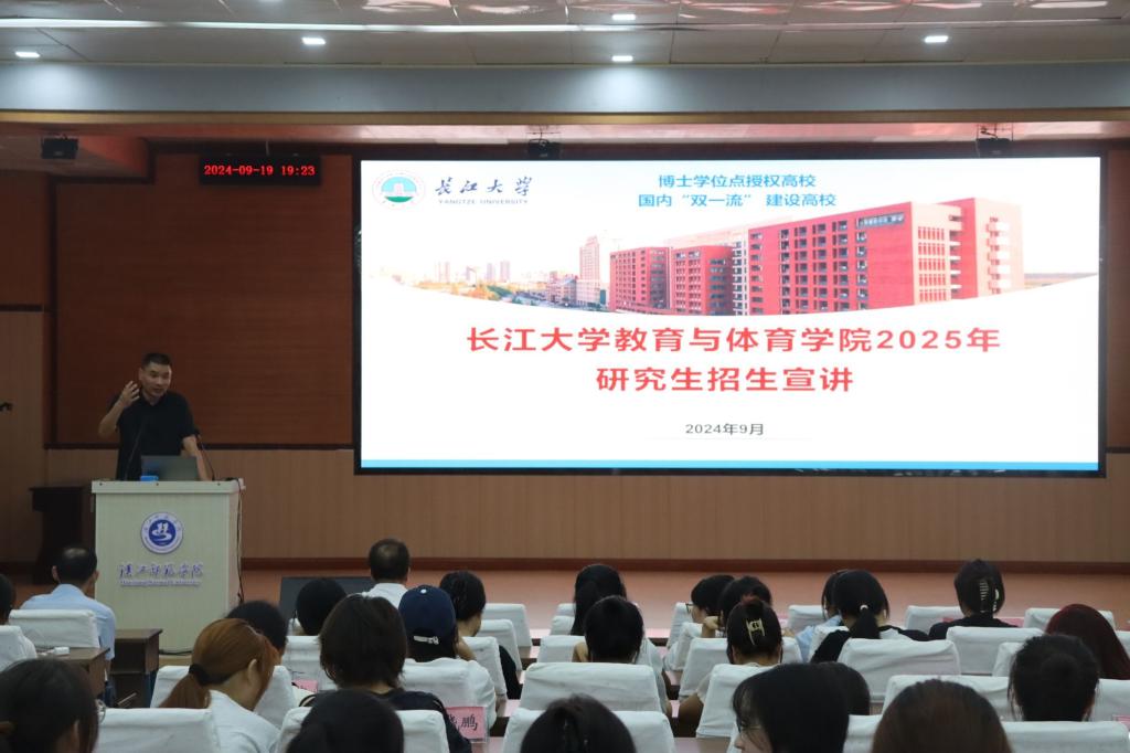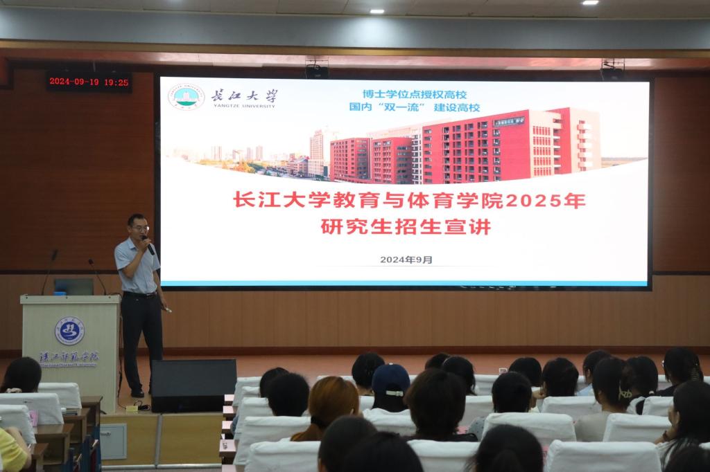 随后,严磊副教授分别对长江大学的基本情况、教育与体育公司的基本情况以及 2025 年研究生招收政策等方面进行了详细讲解。他特别指出,长江大学具有学科专业齐全、团队力量较强、人才培养质量优良、社会服务成效显著、科研成果丰硕、奖助学金体系完善等优势。通过生动的案例和丰富的数据,严磊副教授深入浅出地分析了当前考研形势和各专业的发展趋势,使同学们更加清晰地了解了考研的目标和方向。
