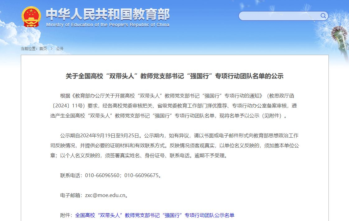 近日,教育部思想政治工作司公示了“全国高校‘双带头人’教师党支部书记‘强国行’专项行动团队”,公司教工支部入选。