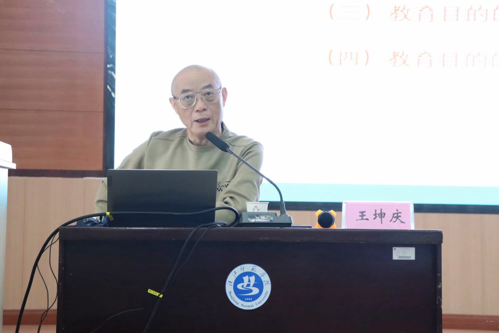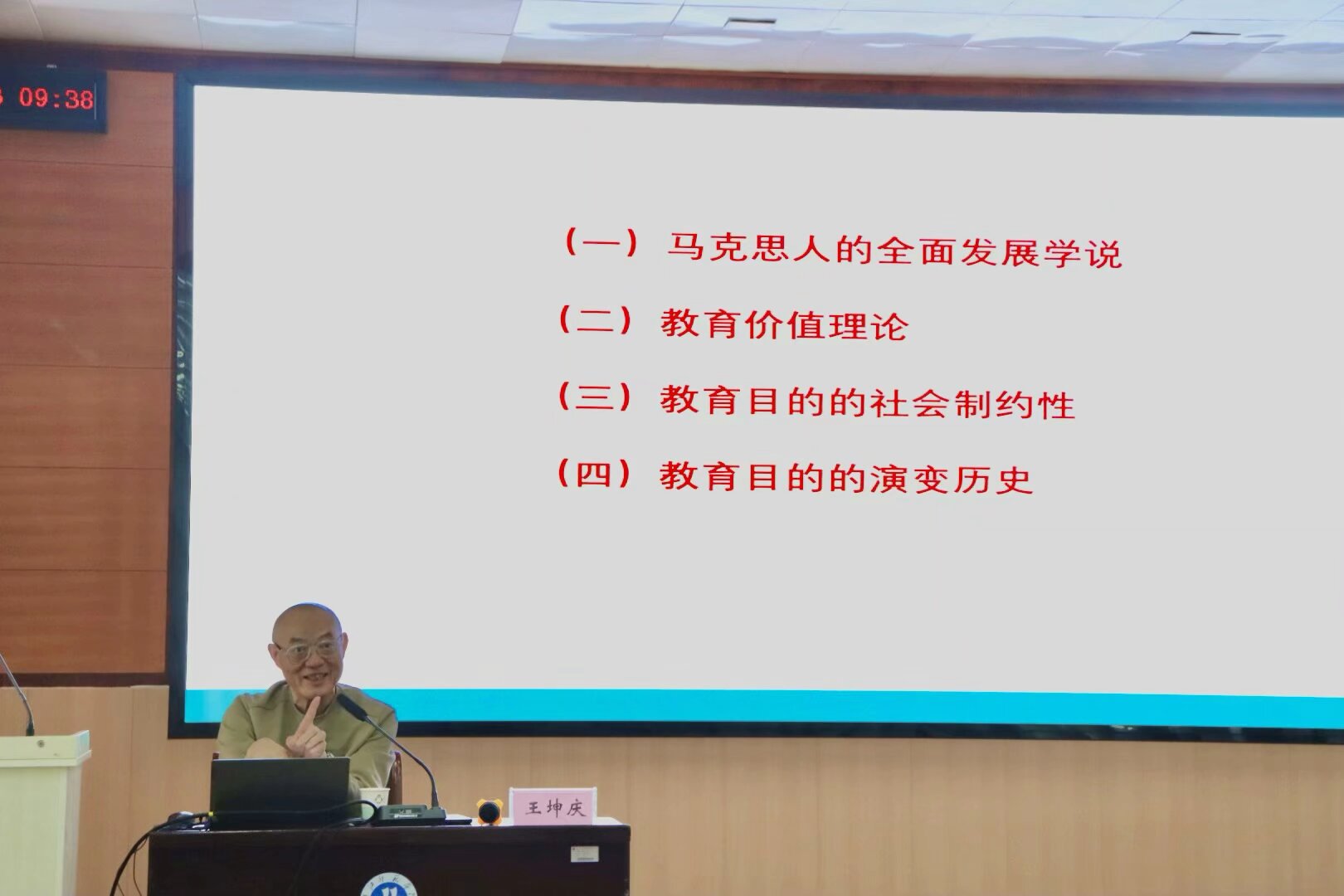 报告会上,王坤庆教授以深厚的学术功底、宽广的学术视野,为与会师生带来精彩纷呈的学术盛宴。他以习近平总书记关于教育的重要论述作为引入,深入剖析了以马克思主义关于人的全面发展学说为代表的教育目的的理论基础,提出在追求全面发展的过程中,如何尊重员工的个体差异,让员工在自由的环境中实现个性发展,是当前基础教育改革面临的重要课题。此外,王教授从构建以人为本的教育目的观、全面打好基础、关注员工的精神世界发展、转变育人方式、重塑教师形象等方面提出基础教育改革的建议。